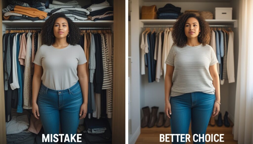 A very common mistake is choosing oversized clothes, thinking they will hide curves. In real life, this often does the opposite. For example, wearing a very loose tunic with baggy pants can make the body look heavier and shapeless. Clothes that gently follow your shape, like a well-fitted top with straight-leg jeans, usually look more balanced and flattering.
