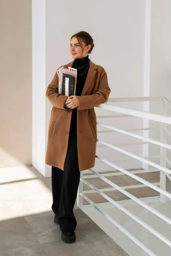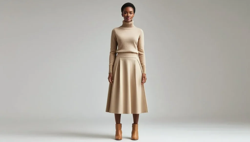 If you prefer warm tones, go for beige or cream shades. A beige turtleneck with a cream midi skirt creates a cozy yet elegant outfit. Complete the look with tan ankle boots for an effortless minimalist touch.