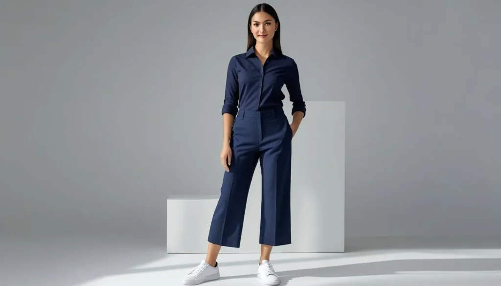 Navy is a great option for those who want color without being loud. Try a navy shirt with navy cropped trousers — stylish yet subtle. Finish with clean white sneakers for a relaxed but smart Casual Friday outfit.
