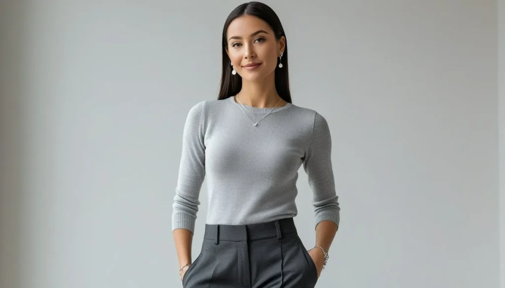 Gray tones give a calm and balanced appearance, ideal for a neutral look. Pair a light gray knit top with charcoal trousers to create soft contrast. Add small silver accessories to keep the outfit polished and refined.
